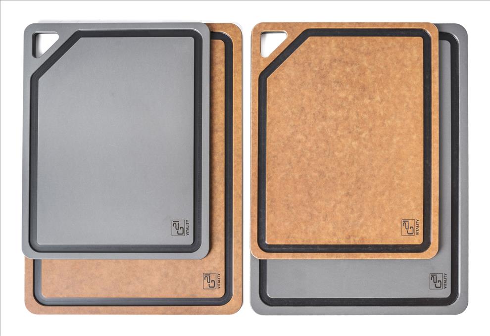Univerzální prkénka EcoCut z biologicky rozložitelné celulózy spojují odolnost, šetrnost k ostří a moderní design. Snadno odolají i horkým hrncům, takže je můžete použít i jako podložku pod horké nádobí. Díky protiskluzové úpravě se prkénka při práci ani nehnou, zůstávají vždy pevně na místě. Praktická drážka po obvodu zachytí šťávy z masa i jiné tekutiny, díky tomu zůstane kuchyňská linka po krájení bez poskvrnky. V balení najdete rovnou 2 velikosti prkének (30 × 23,5 cm a 37 × 27,4 cm), které si zamilujete při přípravě masa, zeleniny, ovoce i bylinek.