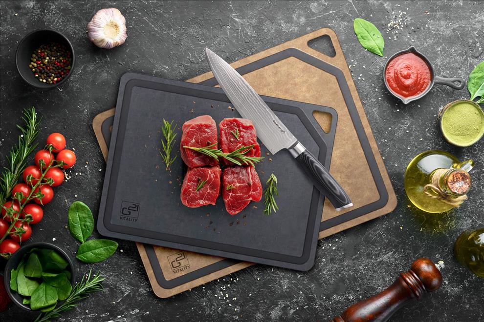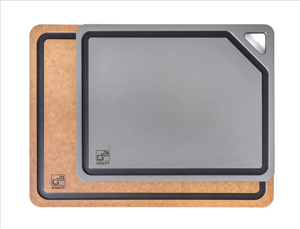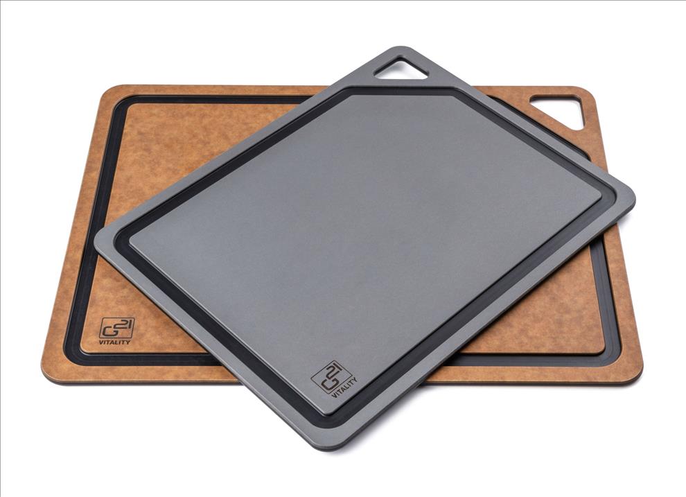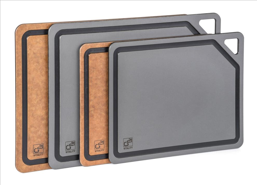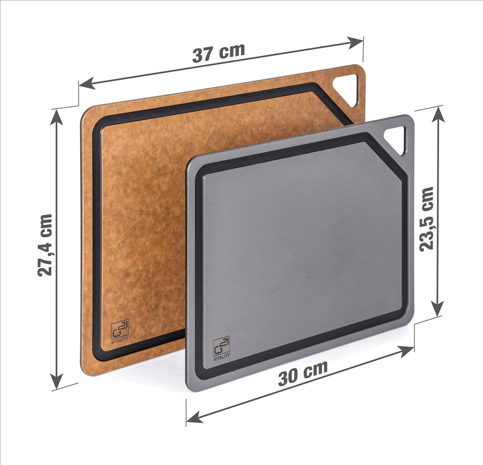 Krájecí prkénka G21 EcoCut z přírodní celulózy, sada 2 ks (30 × 23,5 cm a 37 × 27,4 cm), protiskluzová úprava. Hygienická, neporézní a odolná prkénka jsou šetrná k nožům, vhodná i do myčky.