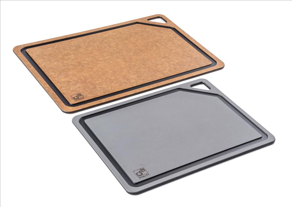 Univerzální prkénka EcoCut z biologicky rozložitelné celulózy spojují odolnost, šetrnost k ostří a moderní design. Snadno odolají i horkým hrncům, takže je můžete použít i jako podložku pod horké nádobí. Díky protiskluzové úpravě se prkénka při práci ani nehnou, zůstávají vždy pevně na místě. Praktická drážka po obvodu zachytí šťávy z masa i jiné tekutiny, díky tomu zůstane kuchyňská linka po krájení bez poskvrnky. V balení najdete rovnou 2 velikosti prkének (30 × 23,5 cm a 37 × 27,4 cm), které si zamilujete při přípravě masa, zeleniny, ovoce i bylinek.