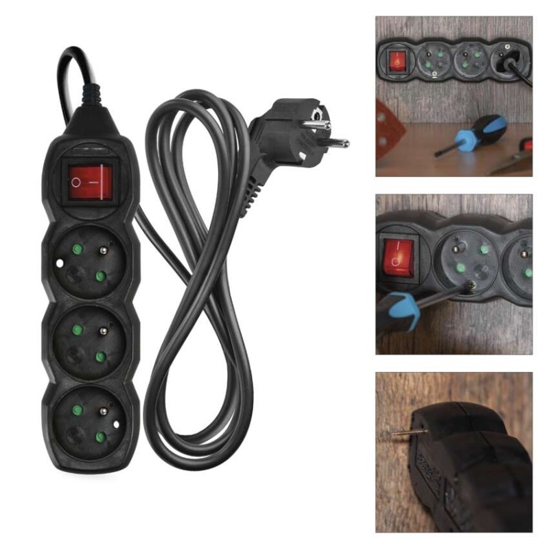 Černý prodlužovací přívod, 3 zásuvka s vypínačem, délkou 1,5 m a průřezem vodiče 1 mm2. Vhodný pro maximální zátěž 16 A max.