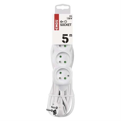 Bílý prodlužovací přívod, 4 zásuvka s délkou 5 m a průřezem vodiče 1 mm2. Vhodný pro maximální zátěž 10 A max.