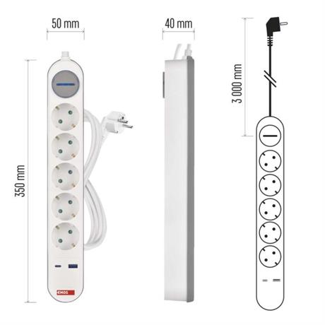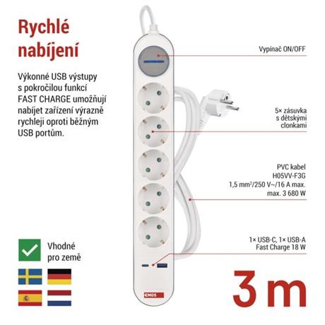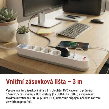 Prodlužovací přívod s vypínačem. 250V~/16A max. 5 zásuvek s dětskými clonkami. USB A+C 3,1 A, 15,5 W max. Délka přívodního kabelu 3 m. Vodič H05VV-F3G 1,5mm2.