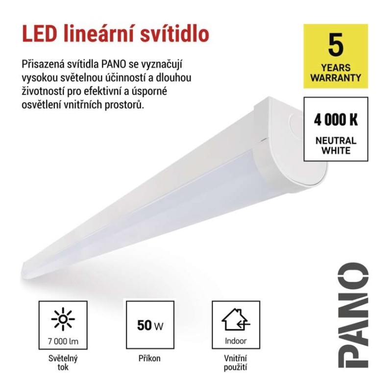 barva světla: neutrální bílá|barva těla: bílá|frekvence: 50/60 Hz|index podání barev (CRI): Ra >80|krytí: IP20|materiál: plast/kov|materiál difuzoru: plast (PC)|materiál spon: nemá spony|materiál těla: ocelový plech|možnost stmívání: ne|náhrada za žárovku: neuvádí se|napětí: 220–240 V|příkon: 25–35–40–50 W|prodejní obal: 1 ks, krabice|proud: 220 mA|průběžná montáž: ano|rozměr: 1 500 × 65 × 66 mm|rozsah pracovní teploty: -20 °C až +40 °C|stupeň ochrany proti mechanickým nárazům: IK06|světelný tok: 7 000 lm|světelný tok v nouzovém režimu: neuvádí se|teplota chromatičnosti: 4 000 K|třída ochrany: I|typ difuzoru: mléčný|typ montáže: přisazená, závěsná, na zeď|typ řízení: neuvádí se|úhel vyzařování: 120°|výdrž baterie: neuvádí se|záruční doba: 5 let|záruka na baterii: neuvádí se|zdroj světla: LED|životnost: 50 000 hodin