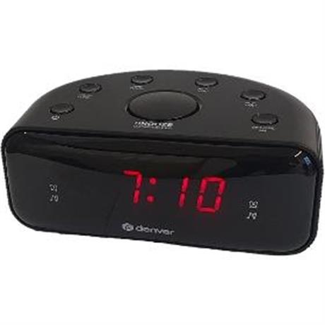 Rádiobudík. Denver CR 430MK2. . Tuner FM. Automatickým vyhledáváním stanic. PLL FM rádio. 10 předvoleb. LED displej s červenými číslicemi 0,6". . Nastavení jasu displeje. Duální funkce alarmu - bzučák nebo rádio. Dva časy buzení. Funkce Snooze & Sleep. Drátová anténa. . Napájení: 230V + záložní baterie pouze pro zálohování hodin (2x AAA - nejsou součástí balení). Rozměry 12,5 x 8,5 x 5,3 cm (šxhxv). Váha 0,27 kg