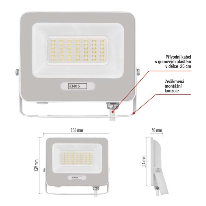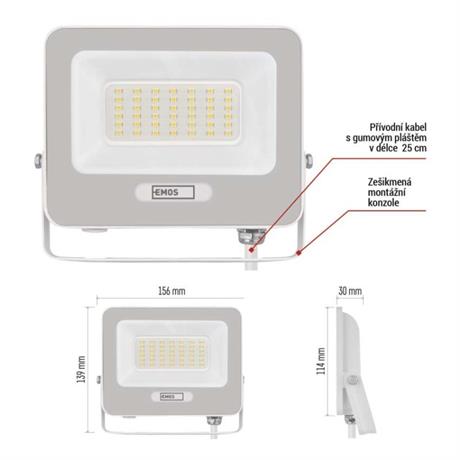 EMOS LED reflektor GLARO 30W, bílý, IP65, 3000 lm, neutrální bílá