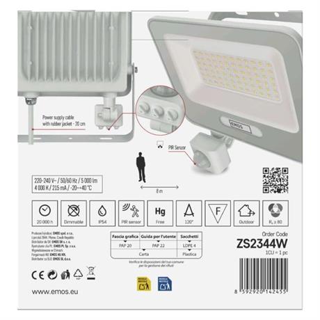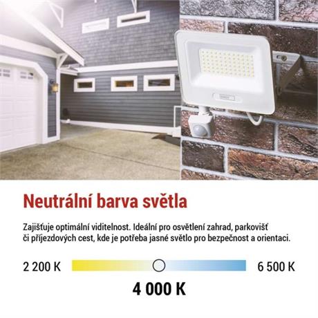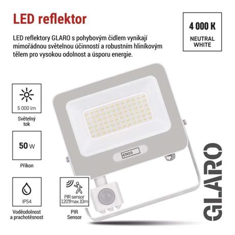 EMOS LED reflektor GLARO s pohybovým čidlem, 50 W, bílý, IP54, 5000 lm, neutrální bílá