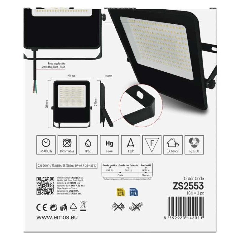 akumulátor: ne|barva: černá|barva světla: neutrální bílá|délka přívodního kabelu: 25 cm|doba svícení na AKU: neuvádí se|dosah PIR senzoru: nemá PIR|energetická třída použitého světelného zdroje: D|flicker-free: ano|frekvence: 50/60 Hz|index podání barev (CRI): Ra > 80|kategorie: CLASSIC|krytí: IP65|materiál difuzoru: sklo|materiál přívodního kabelu: guma|materiál těla: hliník|napájení: ze sítě|napětí: 220–240 V~|PIR senzor: ne|počet průchozích zásuvek: neuvádí se|použití: povrchová montáž|příkon: 100 W|prodejní obal: 1 ks, krabice|proud: 450 mA|řada: –|rozměr: 260 × 226 × 24 mm|rozsah pracovní teploty: -20 °C až +40 °C|stmívání: ne|stupeň ochrany proti mechanickým nárazům: neuvádí se|světelná účinnost: 150 lm/W|světelný tok: 15 000 lm|teplota chromatičnosti: 4 000 K|typ přívodního kabelu: H05RN-F|typ průchozích zásuvek: neuvádí se|typ stmívání: –|účiník: > 0,9|úhel vyzařování: 110°|záruční doba: 3 roky|zdroj světla: LED|životnost: 36 000 hodin|zkušební žárovka součástí balení: ne