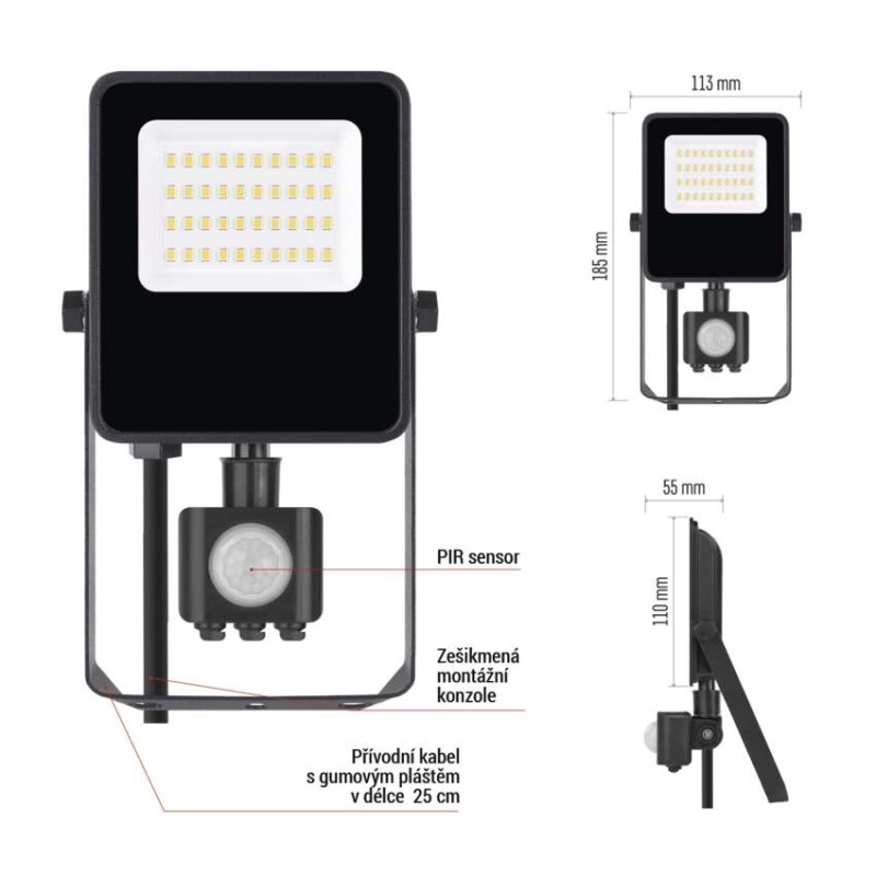 akumulátor: ne|barva: černá|barva světla: neutrální bílá|délka přívodního kabelu: 25 cm|doba svícení na AKU: neuvádí se|dosah PIR senzoru: 10 m|energetická třída použitého světelného zdroje: D|flicker-free: ano|frekvence: 50/60 Hz|index podání barev (CRI): Ra > 80|kategorie: CLASSIC|krytí: IP54|materiál difuzoru: sklo|materiál přívodního kabelu: guma|materiál těla: hliník|napájení: ze sítě|napětí: 220–240 V~|PIR senzor: ano|počet průchozích zásuvek: neuvádí se|použití: povrchová montáž|příkon: 20 W|prodejní obal: 1 ks, krabice|proud: 96 mA|řada: –|rozměr: 185 × 113 × 55 mm|rozsah pracovní teploty: -20 °C až +40 °C|stmívání: ne|stupeň ochrany proti mechanickým nárazům: neuvádí se|světelná účinnost: 150 lm/W|světelný tok: 3 000 lm|teplota chromatičnosti: 4 000 K|typ přívodního kabelu: H05RN-F|typ průchozích zásuvek: neuvádí se|typ stmívání: –|účiník: > 0,9|úhel vyzařování: 110°|záruční doba: 3 roky|zdroj světla: LED|životnost: 36 000 hodin|zkušební žárovka součástí balení: ne