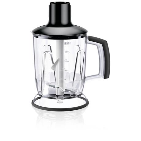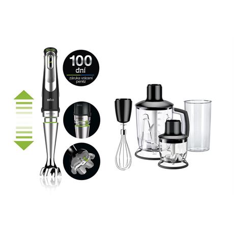 Příslušenství v balení: mixovací nádoba 3v1 o objemu 1,25 l, sekací nástavec (350 ml), šlehací metla, plastová nádoba bez BPA (600 ml)