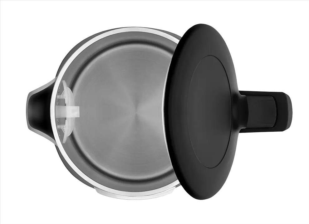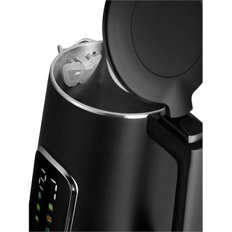 Konvice je vybavena praktickým tlačítkem pro snadné otevření víka jedním stiskem, což výrazně usnadňuje její plnění vodou. Hladké dno se skrytým topným tělesem minimalizuje usazování vodního kamene a nečistot. Plně otočný podstavec umožňuje pohodlné umístění konvice z jakéhokoli směru a zároveň nabízí prostor pro uschování přebytečného kabelu, díky čemuž zůstane kuchyňská linka přehledná a upravená.