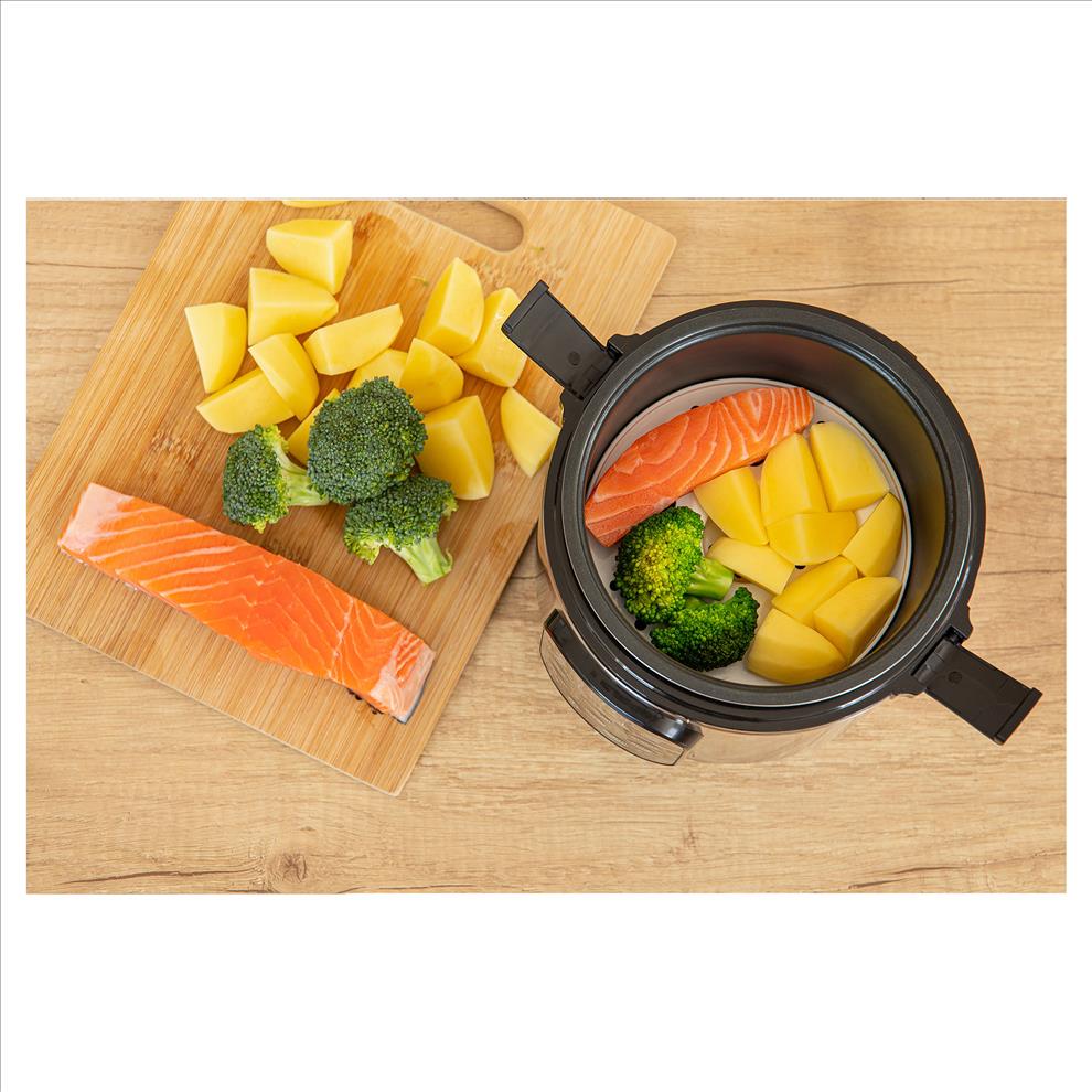 Kvalita mého zpracování je opravdu vysoká! Mám varnou nádobu, která disponuje nepřilnavým povlakem a její stěny zaručují rovnoměrný rozvod tepla. V mém balení najdete i dva parní koše. Oba jsou určeny k vaření v páře a jeden je vyroben i jako praktický přenosný box. Všechny tři nádoby jsou precizně zpracovány pro přípravu jídel ve vysokých teplotách bez uvolňování škodlivých látek! Díky digitálnímu displeji, indikátorům a světelnému upozornění, umožňuji přehled o všech aktuálních a plánovaných aktivitách. Na mě se můžete vždy spolehnout!