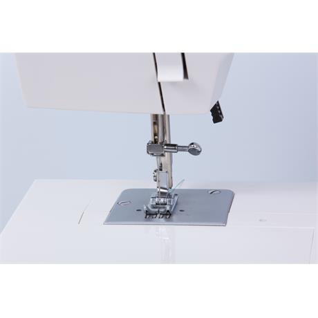 spolehlivé 4krokové šití knoflíkové dírky, plynulé nastavení délky stehu 0 - 4 mm, automatické nastavení tlaku přítlačné patky, nastavitelné napětí horní nitě, snadnou výměnu přítlačné patky pouhým zaklapnutím a automatické navíjení spodní cívky.