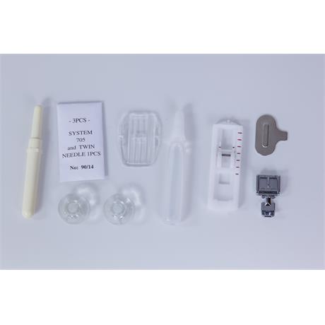 připravenost stroje pro šití dvojjehlou – již základní výbava zahrnuje jak kolík dvojjehly, tak i dvojjehlu. Stále oblíbenější šití dvojjehlou se používá na dekorativní šití a především půvabné vyšívání barevně zajímavých vzorů.