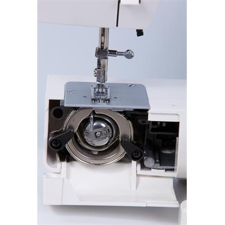 velký kryt volného ramene rozšiřující pracovní plochu a zvyšující pohodlí při šití zejména náročných materiálů, s vnitřní velkou schránkou na příslušenství