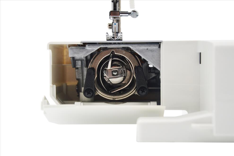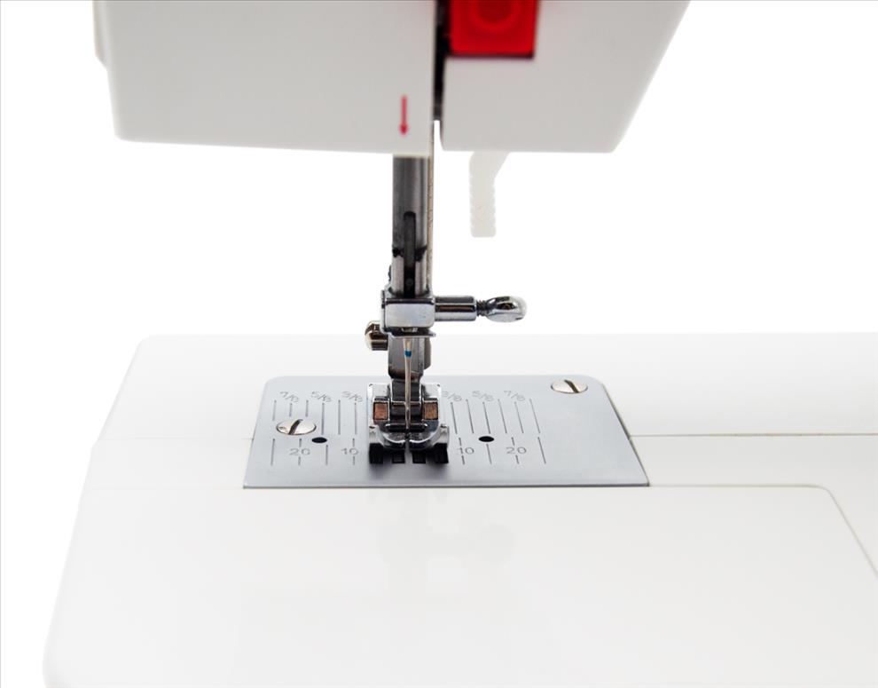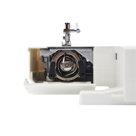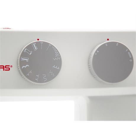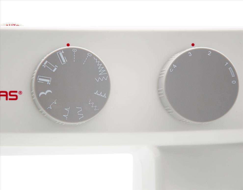 Pravým otočným voličem nastavíte potřebný program šití, levým voličem pak délku stehu v rozmezí 0 – 4,2 mm. Rovněž přítlačnou patku vyměníte jedním pohybem, bez použití nástrojů.