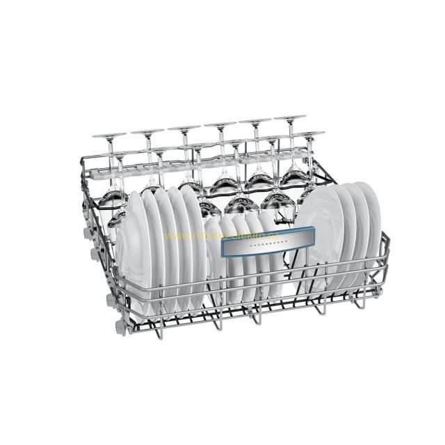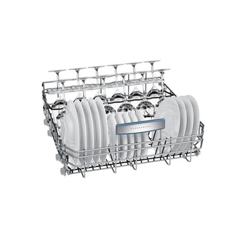Maximální flexibilita při ukládání nádobí díky pohyblivým elementům horního a dolního koše VarioFlex Plus: držák na skleničky na dlouhé stopce ve spodním koši, sklopné trny v horním a dolním koši (6/6), dělitelné sklopné etažéry a přihrádka na příbory vytváří mnoho možností pro přizpůsobení individuálním potřebám. Součástí je příborová zásuvka VarioFlex Plus s pohyblivými stranami a trny v přední části zásuvky. Horní koš můžete výškově nastavit ve třech polohách, a tím vytvořit potřebné místo pro velké hrnce a nádobí.