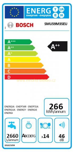 • spotřeba energie v programu Eco 50: 266 kWh/rok na základě 280 standardních mycích cyklů (napojení na studenou vodu) a spotřebě v režimech s nízkou spotřebou energie. Skutečná spotřeba energie závisí na způsobu používání spotřebiče.