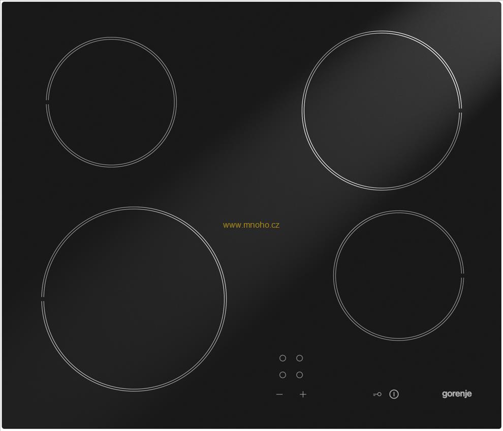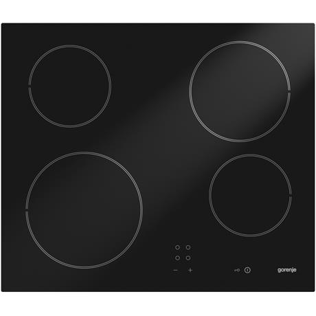 Sklokeramická varná deska Gorenje ECT610SC s dotykovým ovládáním vpředu. Deska má přední hranu broušenou a je opatřena děstkou pojistkou, která uzamkne ovládání desky.
