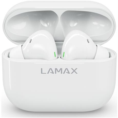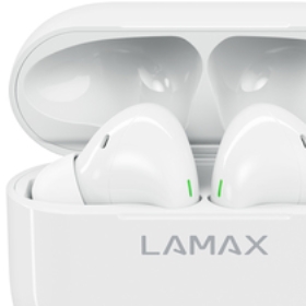 Bezdrátová TWS sluchátka, do uší, 8h výdrž/1 nabití, 40 hodin výdrž celkem, Bluetooth 5.1, dosah až 10 metrů, dotykové ovládání, USB-C, Lamax BeatBass®, automatické párování, herní režim, kodeky AAC a SBC, náhradní náušníky.