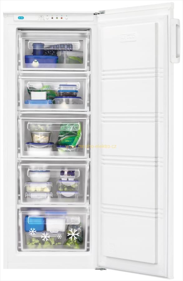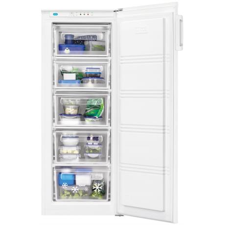 Zásuvkový mrazák ZANUSSI ZFP18400WA v bílém provedení se nachází v úsporné energetické třídě A+. Mrazák je o čistém objemu 157 litrů. Tlačítko rychlého zmrazení, umožňuje rychle zmrazit potraviny, které si tak zachovají maximální čerstvost a minimální znehodnocení. Můžete se automaticky vrátit k normálu. Mechanické ovládání teploty. Vizuální a akustický signál vysoké teploty. Nrazák dokáže zmrazit 8 kg potravin za 24 hodin. Vnitřní prostor mrazáku nabídne 4 police plné šířky a 1 polici poloviční hloubky. Poličky jsou z průhledného plastu. Při poruše dokáže ještě 11 hodin pracovat. Mrazák má manuální odmrazování. Nastavitelné nožičky a zadní pevné válečky.