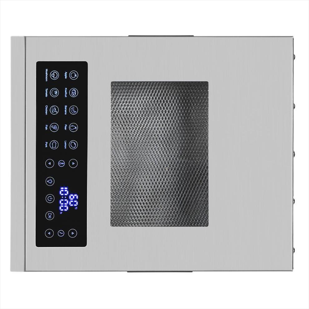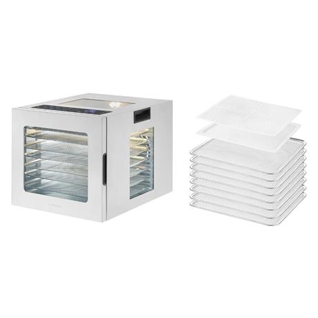 Sušička potravin, 8 nerezových sušicích plat, teplotní rozsah 35–75 °C, nastavitelný čas sušení 1–48 hodin, 10 automatických programů pro různé druhy potravin, vnitřní světlo pro kontrolu procesu