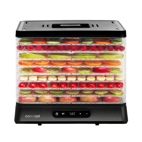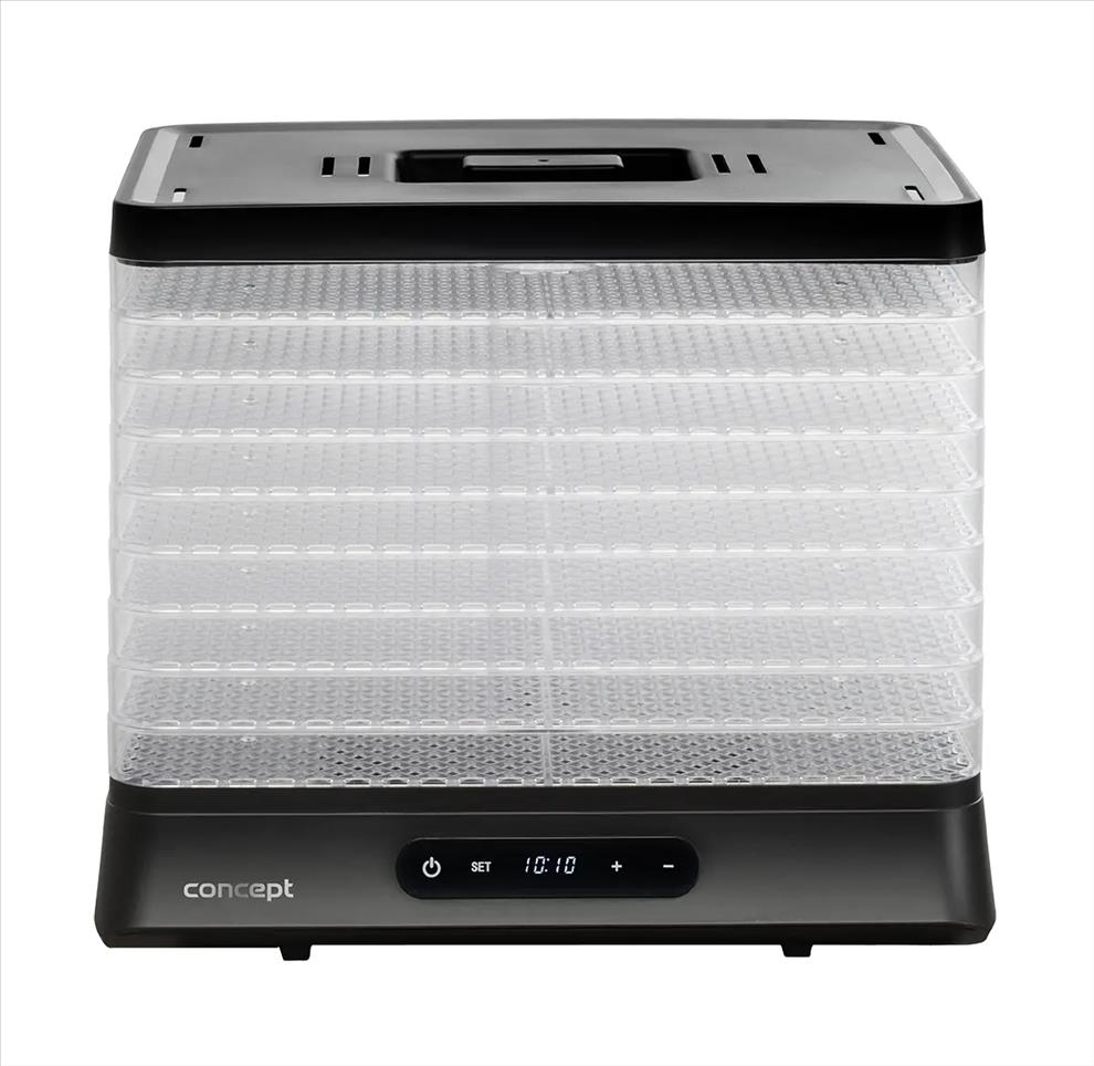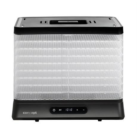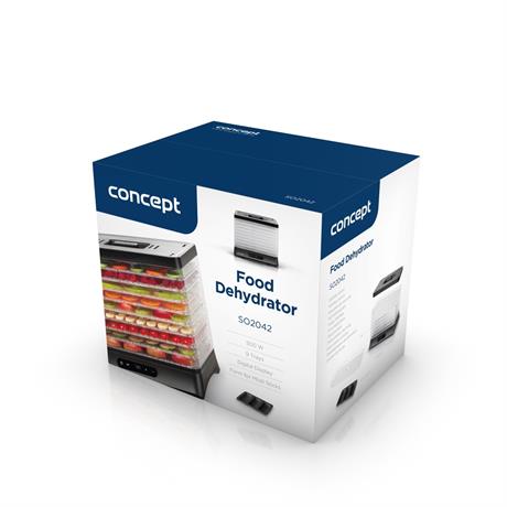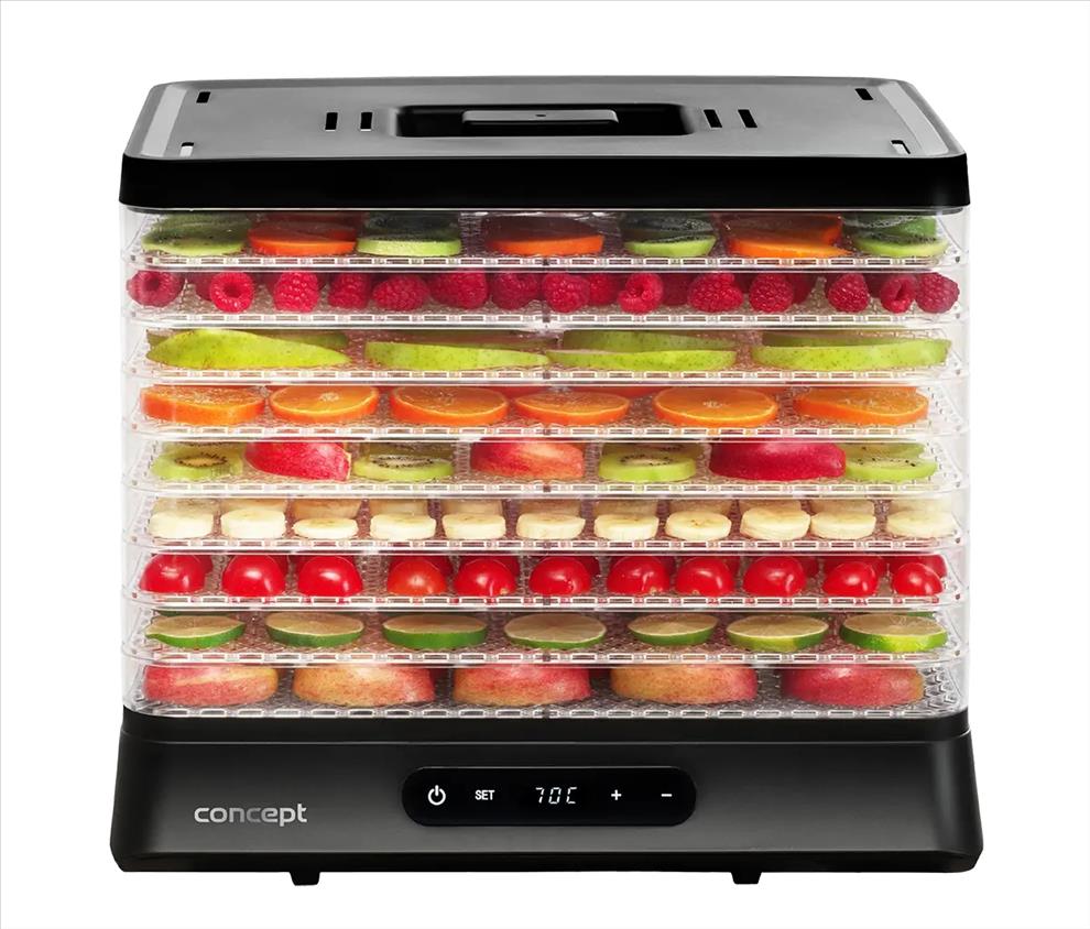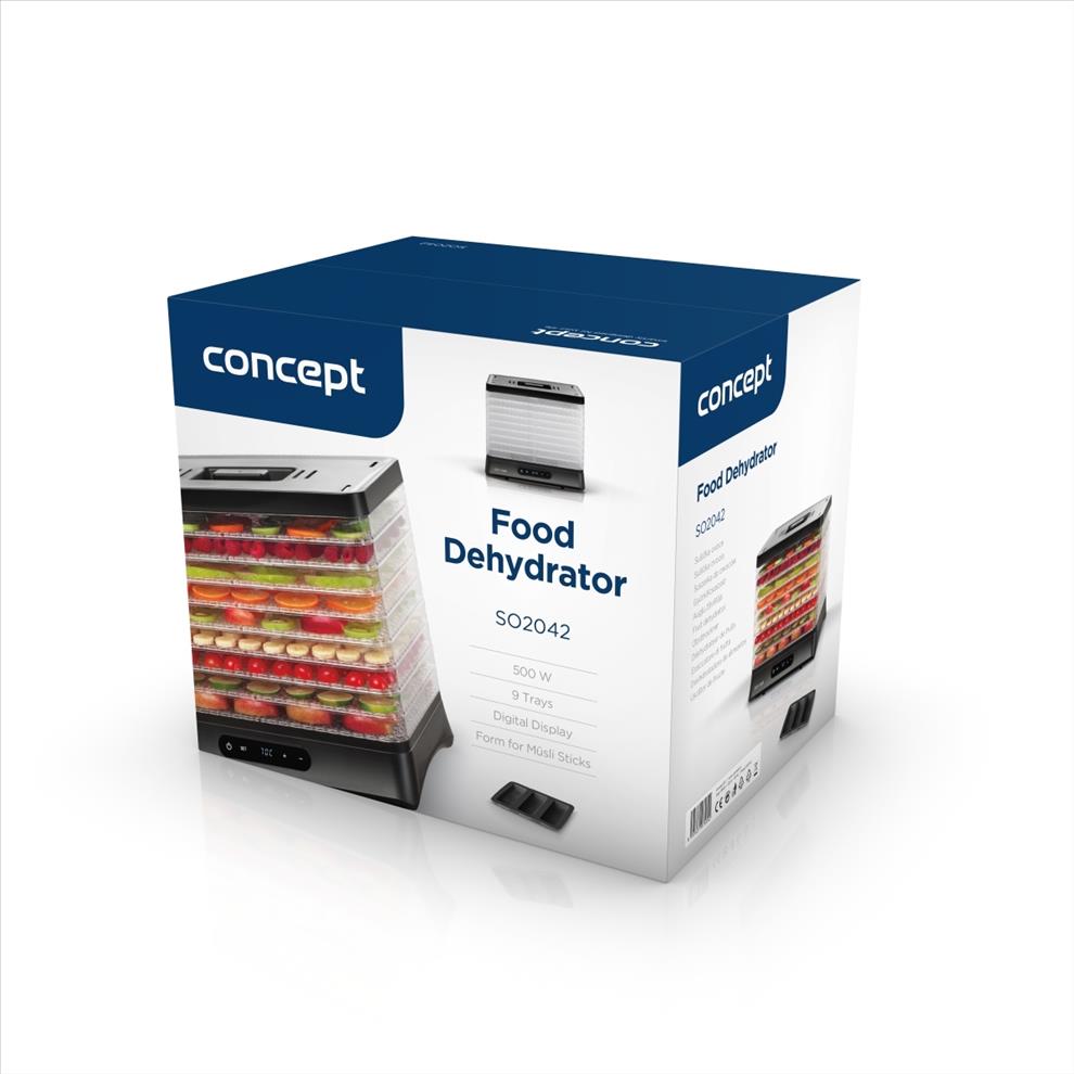 Sušička ovoce Concept SO2042 s digitálním ovládáním a příkonem 500 W nabízí 9 sušicích plat a praktickou silikonovou formu na domácí müsli tyčinky. Díky hranatému tvaru šetří místo a snadno se skladuje.