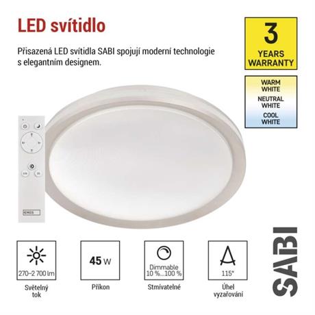 barva světla: teplá bílá–studená bílá|barva těla: bílá|dálkový ovladač: ano|další funkce: –|do chodby a na schodiště: ne|do dílny a garáže: ne|do kanceláře: ano|do koupelny: ne|do kuchyně: ano|do obýváku, ložnice a dětského pokoje: ano|dosah senzoru: nemá senzor|flicker-free: ano|frekvence: 50/60 Hz|index podání barev (CRI): Ra > 80|jazyky aplikace: –|kategorie: EXCLUSIVE|kompatibilita: –|krytí: IP20|materiál difuzoru: plast (PMMA)|materiál LGP: –|materiál těla: plast (PS) + ocelový plech|montážní otvor: –|možnost stmívání: ano|náhrada za žárovku: 170 W|napětí: 220–240 V~|na zahradu a balkon: ne|notifikace do mobilní aplikace: ne|obsah balení: –|ovládání hlasovými asistenty: ne|podporované OS: –|pohybový senzor: –|přenosová frekvence: –|příkon: 45 W|prodejní obal: 1 ks, krabice|protokol: –|proud: 420 mA|řada: SABI|rozměr: 500 × 70 mm|světelná účinnost: 60 lm/W|světelný tok: 270 - 2 700 lm|teplota chromatičnosti: 2 700–6 500 K|tvar: kruh|typ difuzoru: mléčný|typ svítidla: klasické sví
