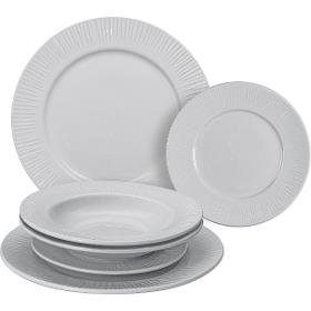 SADA JÍDELNICH TALÍŘŮ KULATÝCH 6 KS FANCY. Lamart LT9080. . Porcelánová sada talířů pro každodenní užití.. Sada jídelních talířů obsahuje 2x mělký talíř, 2x hluboký talíř a 2x dezertní talíř.. Snadná údržba a čistění.. . Tvar kulatý. Průměr 27 cm / 22 cm / 19 cm. Materiál porcelán. Barva bílá