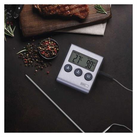 S digitální minutkou a jejími zabudovanými stopkami si vždy pohlídáte správnou délku přípravy jídla. Stačí nastavit počet minut a spustit odpočet. Teploměr E2157 má navíc teplotní alarm, který vás včas upozorní, abyste nic nespálili.