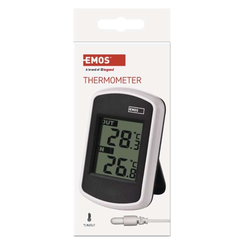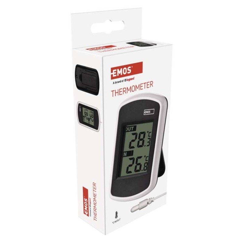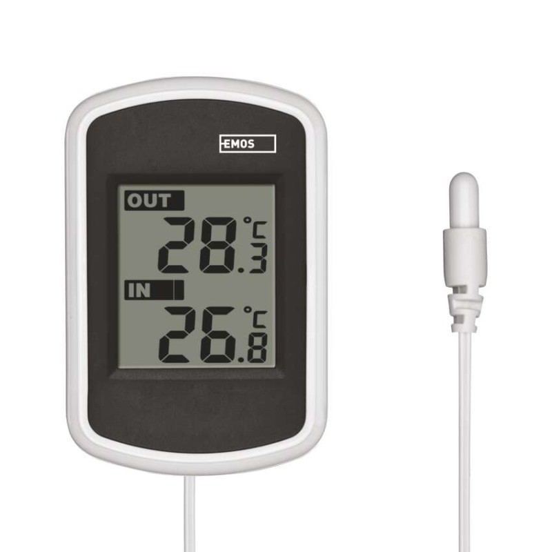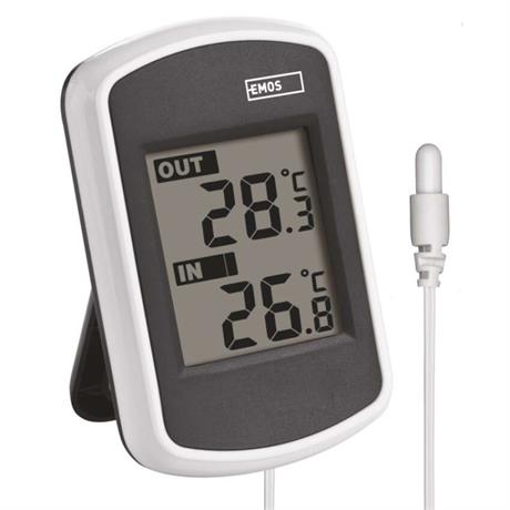 Drátový teploměr se zobrazením venkovní a vnitřní teploty. Teploměr má drátovou sondu v délce 2 m.