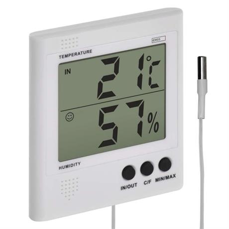 Digitální teploměr s drátovou sondou. Teploměr zaznamenává vnitřní a venkovní teplotu, vnitřní vlhkost, min. a max. teplotu a varuje před námrazou. Sonda teploměru má délku 2 m.