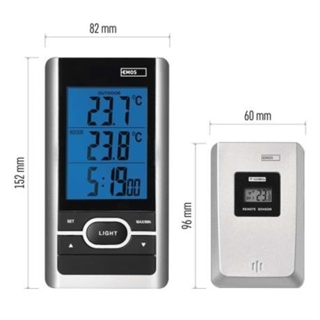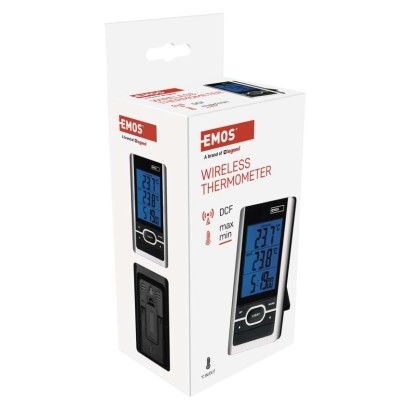 Bezdrátový teploměr s modrým podsvícením displeje. K teploměru se připojuje jedno bezdrátové čidlo s dosahem až 60 m. Teploměr má hodiny řízené DCF signálem.