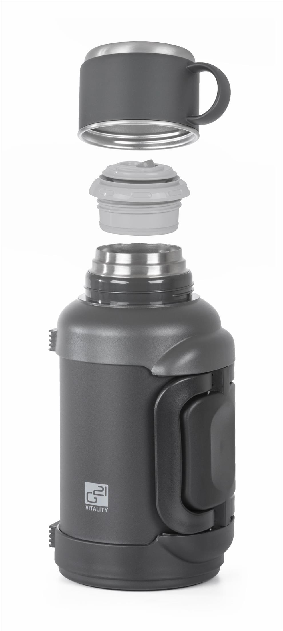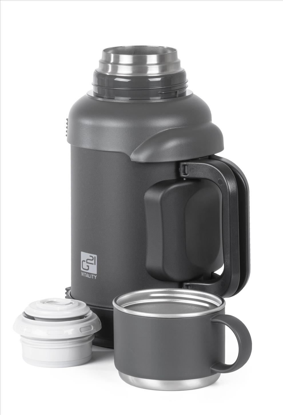 Termoska G21 je vyrobena z kvalitní nerezové oceli a díky dvojitým stěnám a těsnícímu víčku udrží teplotu nápoje po opravdu dlouhou dobu – horké až 12 hodin, studené až 24 hodin.