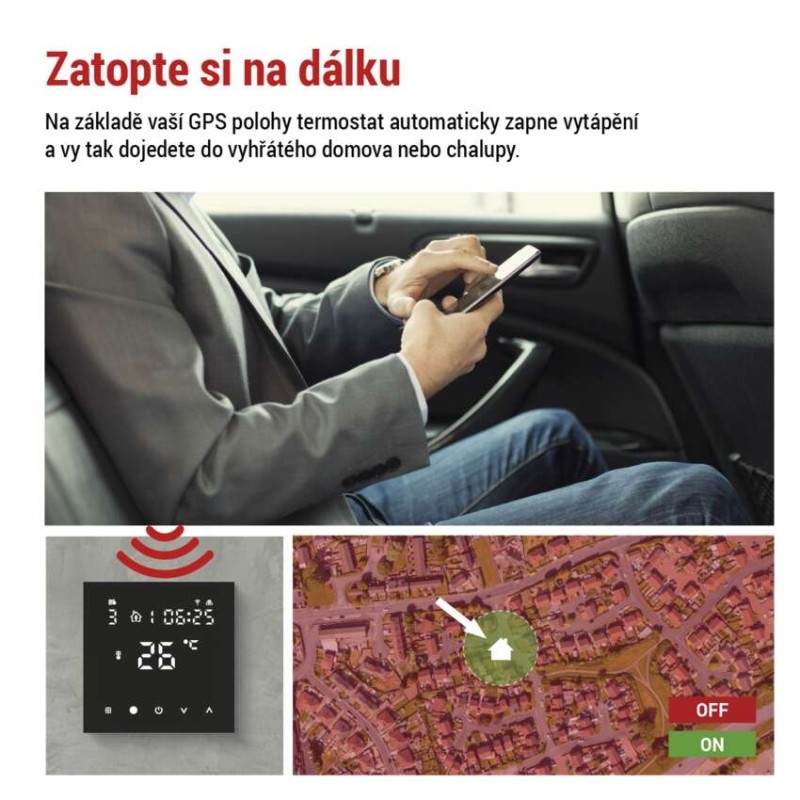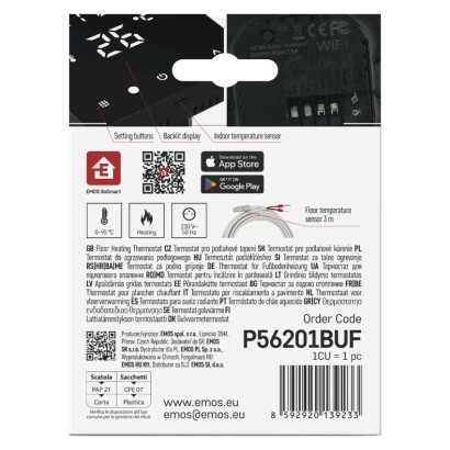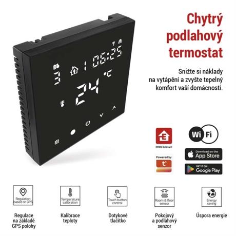 barva: černá|délka kapilárového čidla: neuvádí se|dosah ve volném prostoru: neuvádí se|druh regulace: vytápěcí systém|funkce ON/OFF: ano|funkce prázdniny: ano|funkce Set-back: ne|jazyky aplikace: EN, CZ, SK, PL, DE, HU, SI, FR, + 60 dalších jazyků|kalibrace teploty: ano|kompatibilita: EMOS GoSmart, TUYA, LIDL, Smartlife, Otevřený systém|měření teploty: 0 °C až 95 °C, rozlišení 0,5 °C|možnost propojení s dalšími detektory: neuvádí se|napájení: 230 V AC|napájení brány: neuvádí se|napájení přijímače: neuvádí se|napájení vysílače: neuvádí se|nastavení teploty: 1 °C až 70 °C, po 0,5 °C|nastavitelný rozptyl teploty: vnitřní čidlo: 0,5 °C až 2,5 °C, rozlišení 0,5 °C; podlahové čidlo: 1 °C až 9 °C, rozlišení 1 °C|notifikace do mobilní aplikace: ano|ochrana proti zamrznutí: ano|ovládání hlasovými asistenty: ano (Amazon Alexa, Google Assistant)|počet programů: uživatelsky nastavitelná teplota (6× za den)|podlahové čidlo: NTC 10 k?, 3 m|podporované OS: Android, iOS|podsvícený displej: ano|praco