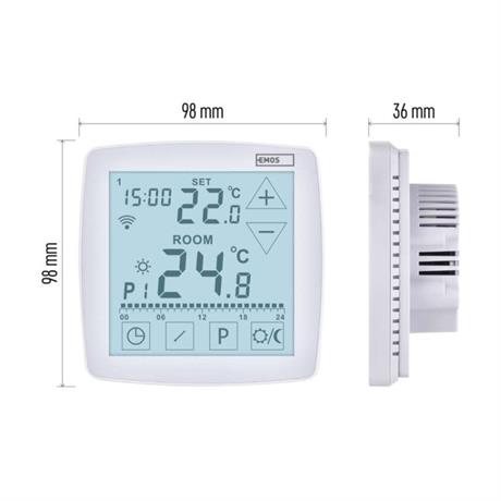 barva: bílá|délka kapilárového čidla: –|dosah ve volném prostoru: –|druh regulace: vytápěcí a chladící systém|funkce ON/OFF: ano|funkce prázdniny: ano|funkce Set-back: ne|jazyky aplikace: EN, CZ, SK, PL, DE, HU, SI, FR, + 60 dalších jazyků|kalibrace teploty: ano|kompatibilita: EMOS GoSmart, TUYA, LIDL, Smartlife, Otevřený systém|měření teploty: 0 °C až 40 °C, rozlišení 0,1 °C|možnost propojení s dalšími detektory: ne|napájení: 230 V AC|napájení brány: –|napájení přijímače: –|napájení vysílače: –|nastavení teploty: 7 °C až 30 °C, po 0,2 °C|nastavitelný rozptyl teploty: 0,1 °C až 1 °C (rozlišení 0,1 °C)|notifikace do mobilní aplikace: ano|ochrana proti zamrznutí: ano|ovládání hlasovými asistenty: ano (Amazon Alexa, Google Assistant)|počet programů: 6 + 3 uživatelsky nastavitelné|podlahové čidlo: NTC 10 k?, 3 m|podporované OS: Android, iOS|podsvícený displej: ano|pracovní frekvence: –|přenosová frekvence: 2,4 GHz WIFI (IEEE802.11b/g/n)|prodejní obal: 1 ks, krabička|protokol: Wi-Fi|rozmě