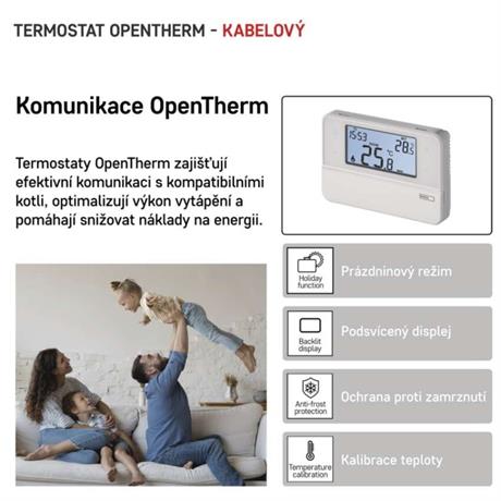 OpenTherm je název pro formu obousměrné komunikace mezi modulem kotlem a termostatem. Termostat získává potřebné informace, které následně zpracovává a předává zpět do kotle, který řídí teplotu vody na nejefektivnější úrovní. Díky posbíraným informacím z OpenTherm termostatu dochází k modulaci výkonu kotle, který plynule přidává a ubírá na výkonu dle požadovaných a naměřených hodnot. Výhodou je regulace výkonu kotle nejen teplotou v místnosti, ale i teplotou vody v systému a dalšími proměnnými. Naproti tomu klasický ON/OFF termostat spíná kotel na 100% výkonu nebo 0% výkonu. OpenTherm tak zvyšuje efektivitu topného systému, snižuje náklady (účty za energii) a zvyšuje životnost kotle.