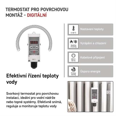 Příložný termostat pro povrchovou montáž. Snímá teplotu vody v zásobnících teplé užitkové vody a nebo v topných systémech. Umožňuje regulaci teploty, hlídání teplotních omezení a funkci poklesu teploty.