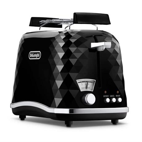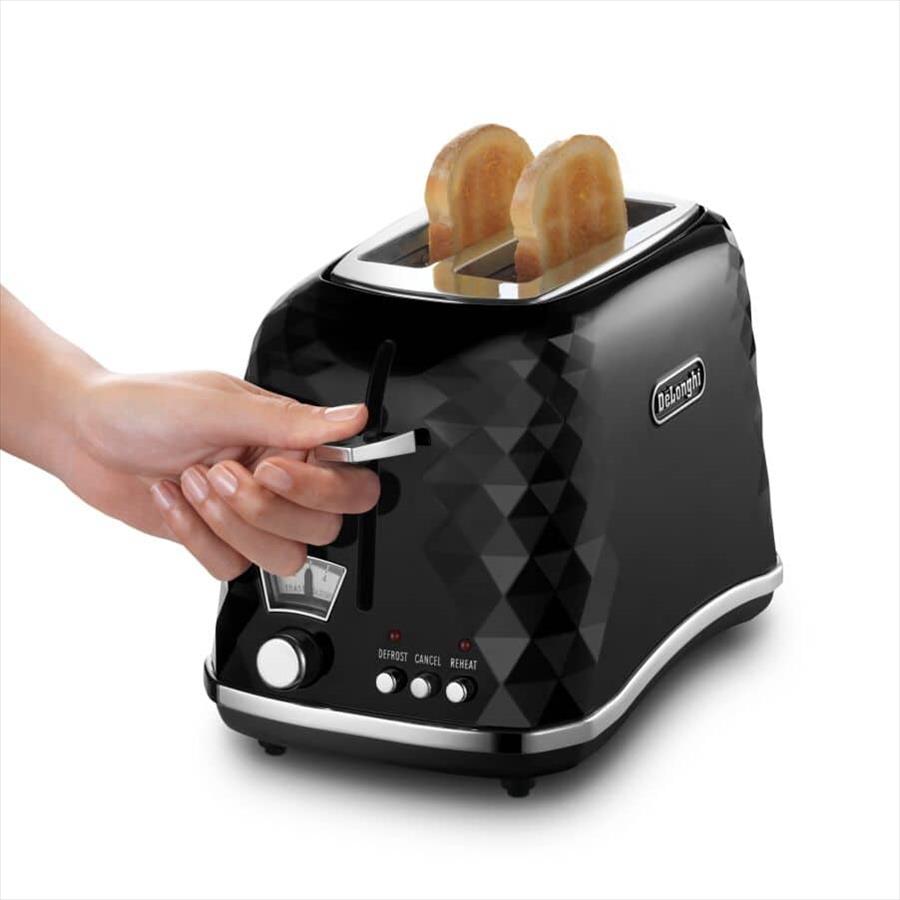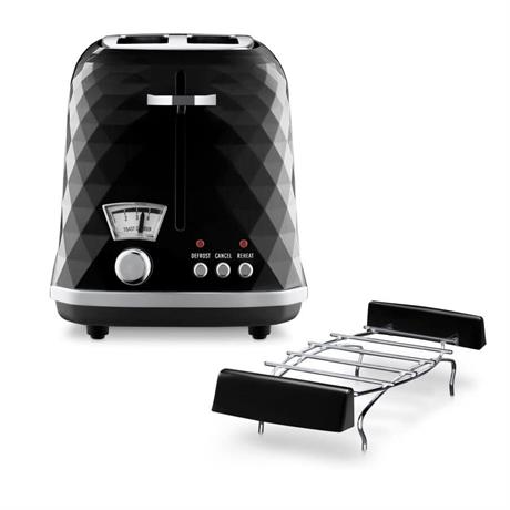 Topinkovač - na 2 topinky, regulace opékání, opětovný ohřev, rozmrazování, tlačítko okamžitého ukončení, automatické vypnutí, vysoký zdvih, centrování a rozpékač, součástí vyjímatelná miska na drobky, příkon 900 W, materiál plast, barva černá