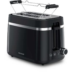 Topinkovač. Sencor STS 2710BK. . Dva otvory pro opékání dvou toustů. Tři funkce v jednom: ohřev, přerušení a rozpékání/rozmrazování. Automatické vypnutí a vysunutí pečiva. Funkce automatického centrování pro rovnoměrný ohřev. Zásobník na drobky pro snadnéčištění. Opékací mřížka.