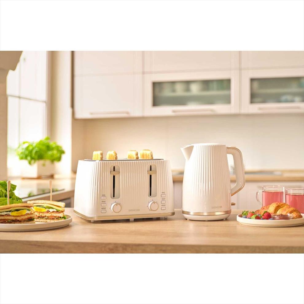 Pokud si chcete vybavit kuchyň spotřebiči v jednotném stylu, je snídaňový set 2 topinkovačů a konvice tím pravým pro vás. Designové spotřebiče mají elegantní světlý vzhled, který se hodí do každého moderního interiéru.