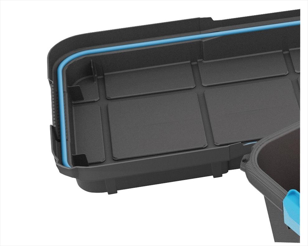 Černý plastový box, gumové těsnění po obvodu víka, snadné uzavírání, ochrana věcí před namočením, prachem, špínou, kolečka pro snadný přesun boxu, možnost uzamknutí pomocí visacího zámku, ergonomická rukojeť, rozměry 49,5 x 34 x 39 cm.