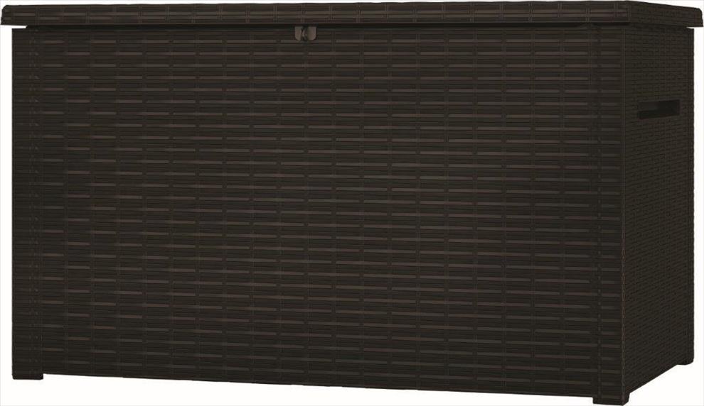 Hnědá barva ratanové imitace. Úložný prostor 137 x 56 x 63 cm, kapacita 870 l, 50kg nosnost. Podlahový panel chrání proti vodě, bahnu, prachu a dalším nečistotám, vyztužení žebrovými segmenty. Polypropylenová pryskyřice.