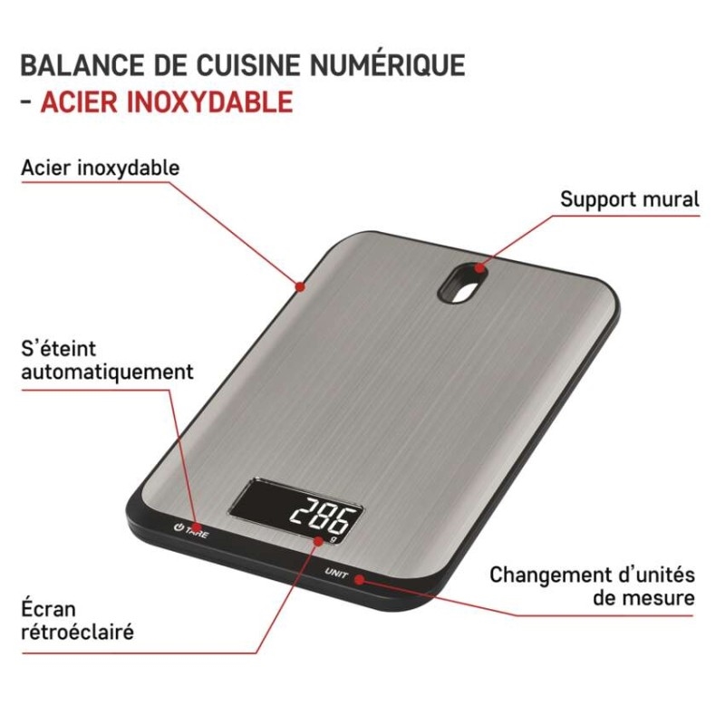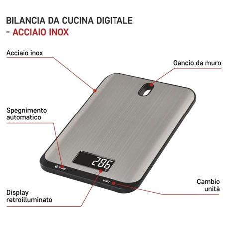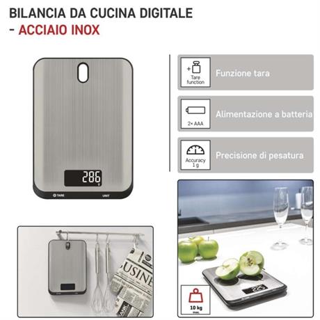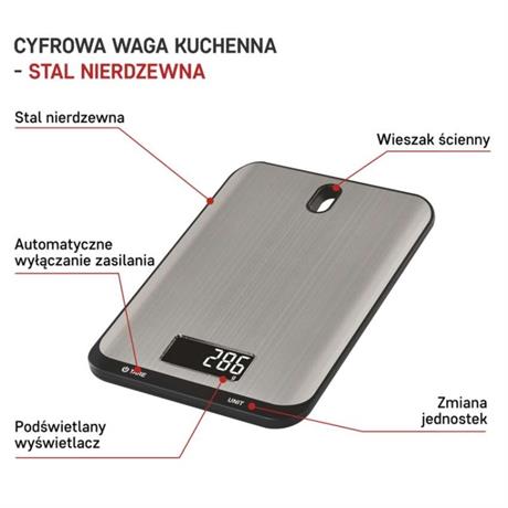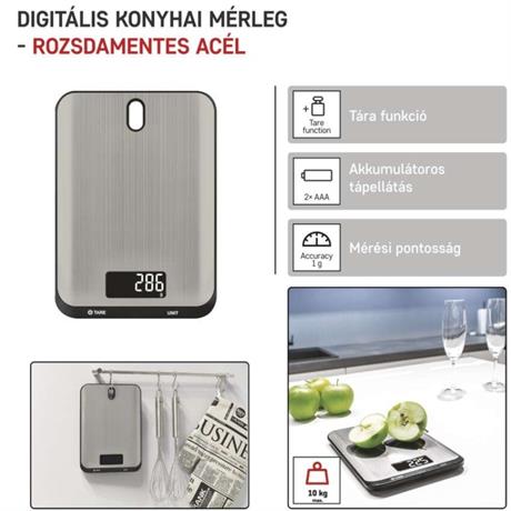 Maximální zátěž až 10 kg, podsvícený displej, dotyková tlačítka s rychlou odezvou, otvor pro zavěšení, nerezový povrch.