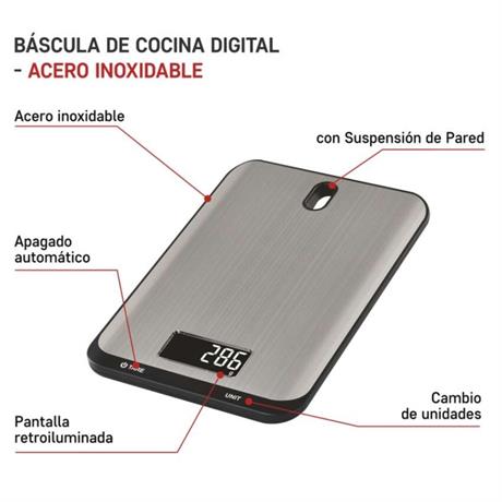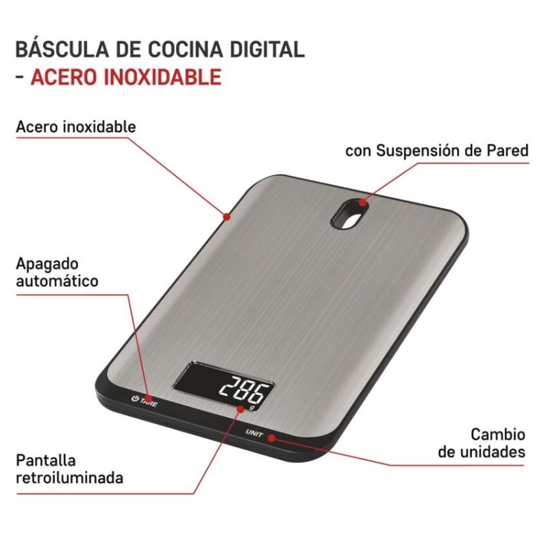 Kombinace odolného nerezu s moderním displejem a štíhlým vzhledem tvoří z váhy stylový kousek, který se bude vyjímat na každé kuchyňské lince. Praktický otvor v těle váhy umožňuje její pohodlné zavěšení. Vždy tak bude po ruce, když ji budete potřebovat. Díky zavěšení nehrozí její poškození při skladování společně s jinými těžkými kuchyňskými spotřebiči. Nespornou výhodou je také podsvícený displej, z něhož je skvěle čitelná přesná hmotnost vážené suroviny.