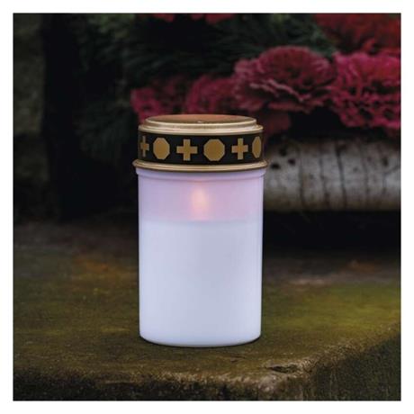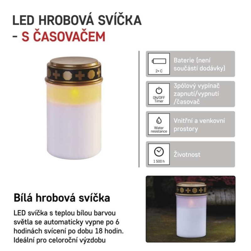 Zapálená svíčka v období dušiček představuje projev lásky, úcty a symbolizuje neuhasínající vzpomínku na blízké zemřelé. Při návštěvě hřbitova a výzdobě hrobu můžete použít bílou LED hřbitovní svíčku, jejíž plamen nesfoukne ani ten nejsilnější vítr. Díky kvalitě provedení a mihotajícímu se světlu teplé bílé barvy (vintage) je k nerozeznání od tradiční voskové varianty. Na rozdíl od ní však vydrží svítit mnohonásobně déle díky použití baterií typu C a funkci časovače, který ji opakovaně každý den rozsvítí ve vámi určený čas po dobu 6 hodin a následně ji na 18 hodin vypne. Svíčka tak přes den šetří energii a svítí pouze v noci, kdy je to žádoucí. Navíc nehrozí ani nechtěné požáry tradičních voskových svíček – tuto LED variantu můžete bez starostí umístit na libovolné místo, například blízko hřbitovního věnce.