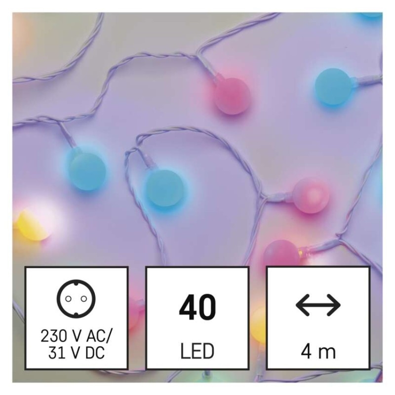 barva drátu: bílá|barva světla: multicolor|časovač: ano|dálkový ovladač: ne|délka přívodu: 5 m|funkce: svítí|krytí: IP44|LED mezera: 10 cm|materiál: PVC|možnost propojení: ne|počet LED: 40|použití: venkovní i vnitřní|příkon: 3,6 W|prodejní obal: 1 ks, krabice|produkt: řetěz|pro výšku stromu: 100 cm|rozměr: 4 m|tvar: kulička|typ napájení: síťový adaptér|velikost LED: 25 mm|vstupní napětí: 230 V AC|výstupní napětí: 31 V DC|záruční doba: 2 roky|životnost: 10 000 hodin