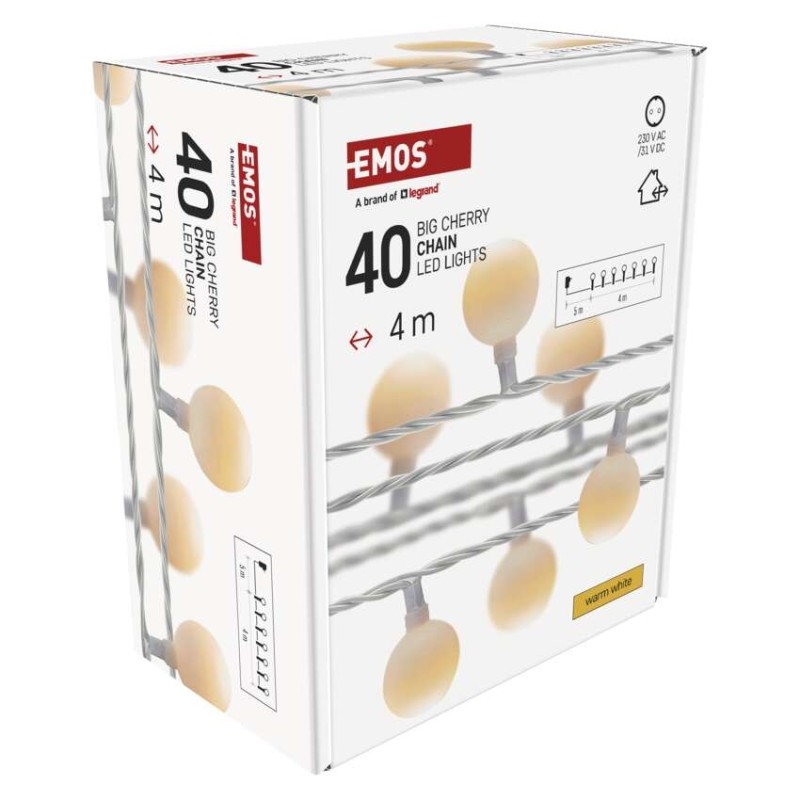 Řetězy CHERRY – s velkými kuličkami nabízejí širokou škálu použití nejen při tvorbě vánoční výzdoby a atmosféry. Jejich LED světýlka jsou schovaná v kuličkách o průměru 2,5 cm, které jsou ozdobou i ve chvílích, kdy řetěz nesvítí. Na základě zvolené délky a barvy světla se postarají o ozdobení malých dekorací v interiéru, rozsvícení vánočního stromečku i většího stromu na zahradě. Skvěle se hodí pro vytvoření slavnostní atmosféry na rodinné oslavě, svatbě nebo dětské párty. Všude tam mohou během dne bílé kuličky vypnutého řetězu CHERRY sloužit jako dekorace, která se po setmění rozzáří a navodí tu pravou atmosféru. Řetězy CHERRY jsou tak doslova dva v jednom.