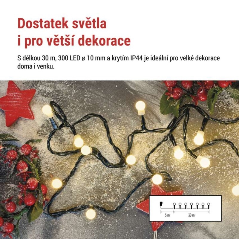 EMOS LED vánoční cherry řetěz – kuličky, 30 m, venkovní i vnitřní, teplá bílá, programy,časovač