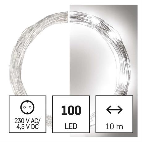 barva drátu: stříbrná|barva světla: studená bílá|časovač: ano|dálkový ovladač: ne|délka přívodu: 5 m|funkce: svítí|krytí: IP44|LED mezera: 10 cm|materiál: kov|možnost propojení: ne|počet LED: 100|použití: venkovní i vnitřní|příkon: 2,7 W|prodejní obal: 1 ks, krabice|produkt: nano řetěz|pro výšku stromu: 160 cm|rozměr: 10 m|tvar: nano|typ napájení: síťový adaptér|velikost LED: 3 mm (nano)|vstupní napětí: 230 V AC|výstupní napětí: 4,5 V DC|záruční doba: 2 roky|životnost: 10 000 hodin