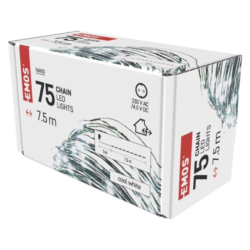 barva drátu: zelená|barva světla: studená bílá|časovač: ano|dálkový ovladač: ne|délka přívodu: 5 m|funkce: svítí|krytí: IP44|LED mezera: 10 cm|materiál: kov|možnost propojení: ne|počet LED: 75|použití: venkovní i vnitřní|příkon: 2,7 W|prodejní obal: 1 ks, krabice|produkt: nano řetěz|pro výšku stromu: 140 cm|rozměr: 7,5 m|tvar: nano|typ napájení: síťový adaptér|velikost LED: 3 mm (nano)|vstupní napětí: 230 V AC|výstupní napětí: 4,5 V DC|záruční doba: 2 roky|životnost: 10 000 hodin